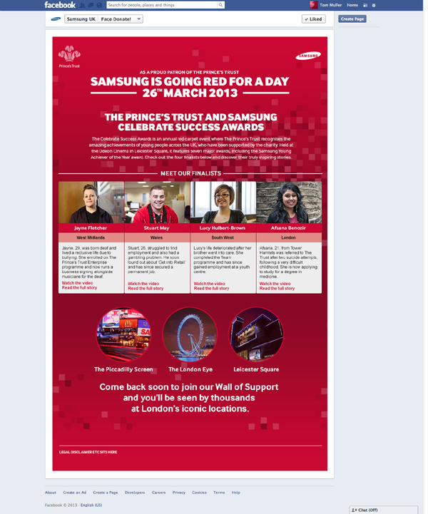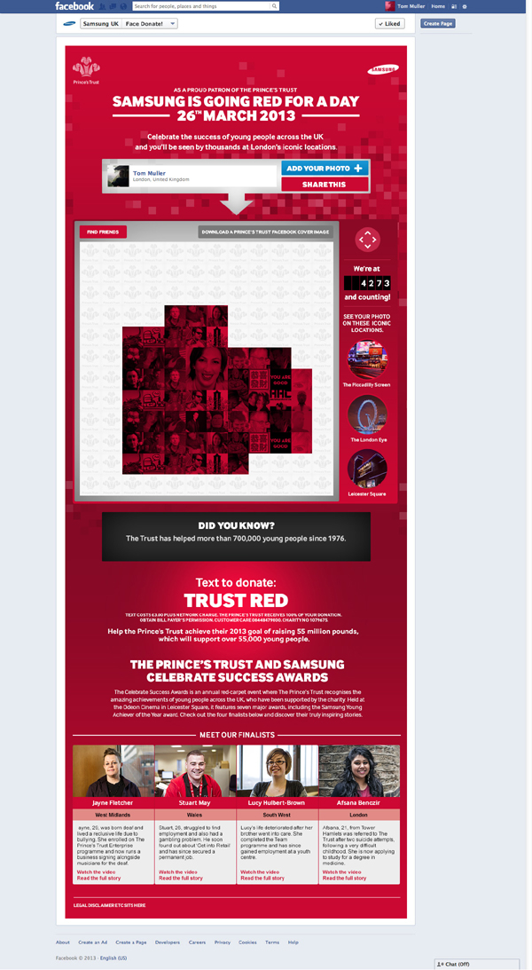 The Facebook app we created would capture hundreds of people's faces, turned red in support of the princes trust and the resulting canvas would be used as wallpaper at the events on the 26th and also shown on the big screens at Piccadilly and Leicester Square.