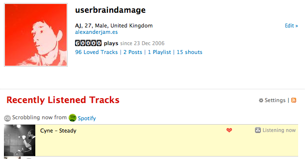 I've been scrobbling since 2006 and despite the limitations imposed by prehistoric car stereos, CD players, iPods and mobile phones, I've managed to rack up a monumentous 208 days of continous, verifiable playback.Â