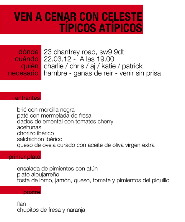 Celeste’s. Being our very own Spanish senorita, it was a lovely decision to be greeted with an all-Spanish menu. Upon arrival our hostess showed us around her new apartment and we sat down for the first course, a collection of starters, Queso de oveja curado with extra virgin olive oil, Iberic chorizo, Pâté with strawberry marmalade, Olives, and Brie with black pudding. With, “Tinto de verano,†(a traditional drink consisting of red wine and lemonade) washing down we moved onto the main course, “Plato Alpujarreño,†(Paprika in the oven and tuna fish salad) and Toast with pork, jamon, cheese, tomatoe and Piquillo paprika. For Celeste’s entertainment we had a form of a Spanish lesson (always learning!) Celeste would read extracts from a novel and we would repeat it back to her. Needless to say, after a few glasses of wine we all thought we were much better than we are, much to Celeste’s hilarity. Finishing off the evening we were served a delicious flan with orange shots. Then off into the Brixton night to continue the festivities further!