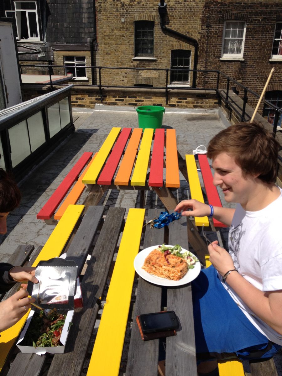 Armed with paint and a couple of brushes I took to the roof and put paint to wood. Branding the beloved benches, hand crafted by Charlie himself, in the vibrant colours of Put It Out.